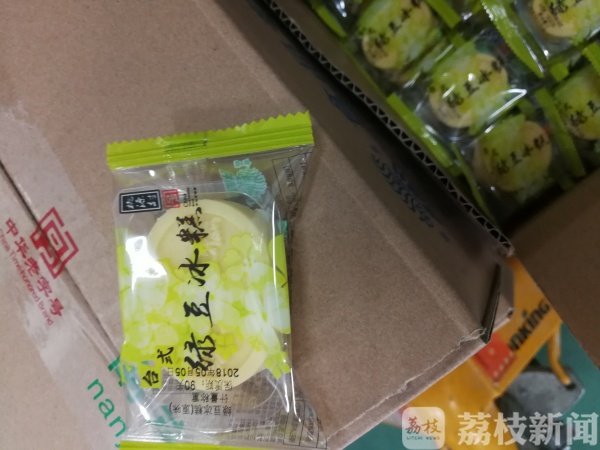 “现在我们检的是绿豆糕。这一箱是随机的,这个绿豆糕是要称重销售的。我们抽样的时候要保证它们是同一批次的,所以也要看它们的批号和生产日期。”