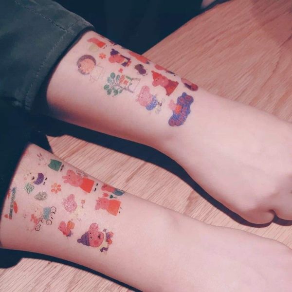 为了亲身体验一下“社会人”文身,记者网购了一些文身贴,剪下一个小猪佩奇的图案,撕掉图案上覆盖的透明胶纸,用冷水打湿图案背面的白纸,贴在手臂上。过了半分钟取下,小猪佩奇的图案清晰可见。