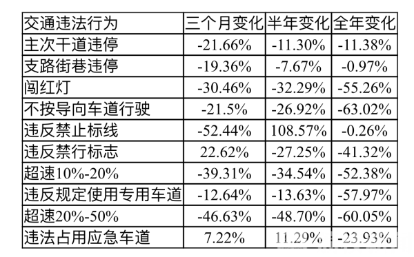 超速20%—50%的交通违法行为也出现了明显下降,降幅为60.05%,较去年11月20日半年时48.7%的下降率来说进一步减少;超速10%—20%的下降情况也很明显,较去年11月20日34.54%下降率进一步下降到52.38%。违反规定使用专用道下降了57.97%,而去年11月20日时下降率仅为13.63%;闯红灯的降幅也不小,达到55.26%,而半年时该违法行为下降率为32.29%。