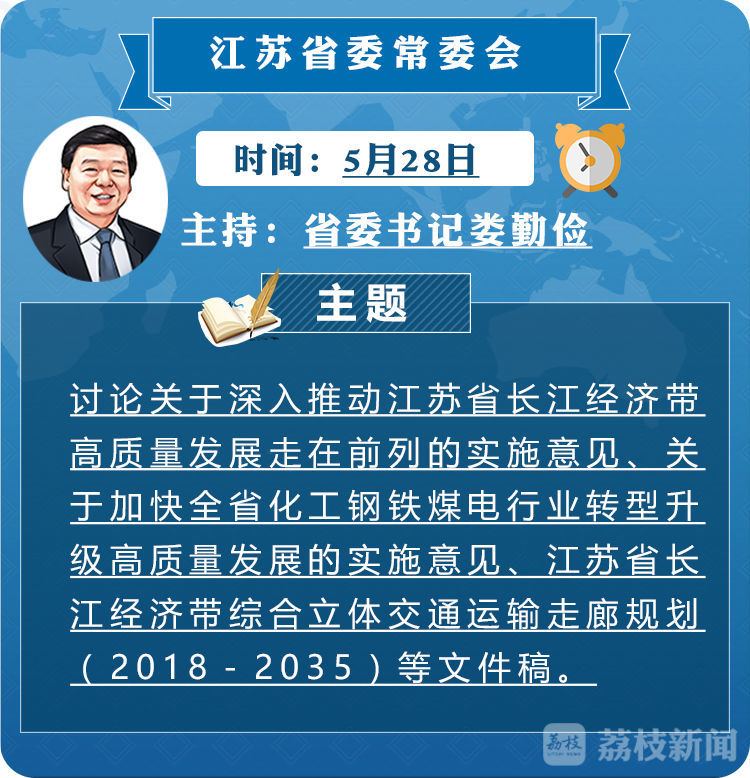荔枝新闻讯 5月28日,江苏省委常委会召开会议,讨论关于深入推动江苏省长江经济带高质量发展走在前列的实施意见、关于加快全省化工钢铁煤电行业转型升级高质量发展的实施意见、江苏省长江经济带综合立体交通运输走廊规划(2018-2035)等文件稿。