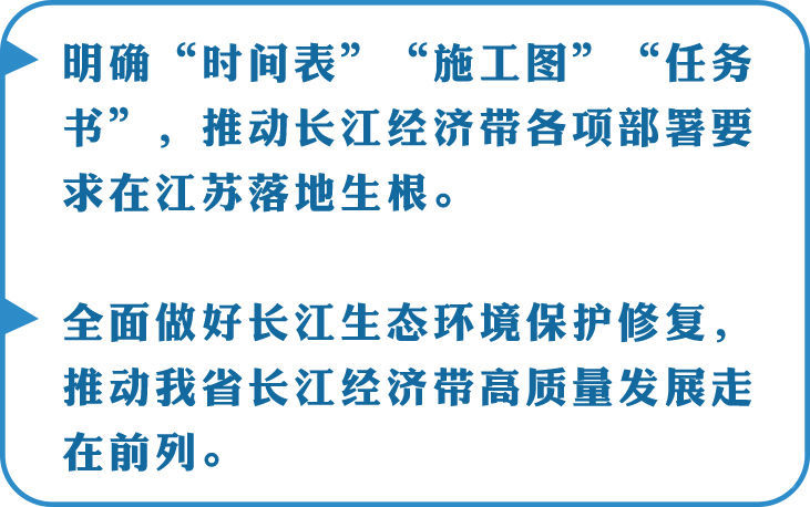 会议指出,推动长江经济带发展,是以习近平同志为核心的党中央作出的重大决策,是关系国家发展全局的重大战略。要坚决贯彻习近平总书记深入推动长江经济带发展重要讲话精神,紧扣中央精神和江苏实际,提高政治站位,坚持使命担当,突出重大问题和关键环节,坚持对症下药、系统施治,坚持主攻沿江、兼顾全省,明确“时间表”“施工图”“任务书”,推动长江经济带各项部署要求在江苏落地生根。要全面做好长江生态环境保护修复,协同推进生态优先、绿色发展,切实强化规划引领和长效管控,加快建设现代化经济体系,着力加强区域协同联动,全力保障工作落实,推动我省长江经济带高质量发展走在前列。