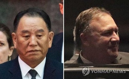 资料图片:金英哲(左)和蓬佩奥。(图片来源:韩联社)
