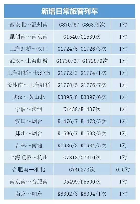 本次调图中,长三角铁路共增开旅客列车61对,其中日常旅客列车14.5对、周末线列车2对、高峰线列车44.5对。增开的14.5对日常旅客列车主要方向为上海虹桥至汉口、武汉、长沙南、杭州,南京南至昆明南、合肥南,南京至如东,温州南至西安,宁波至漯河,南通至吉林等。