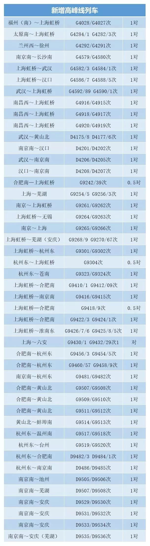 高峰线上海虹桥~合肥南G9402/3次0.5对延伸至金寨终到。
