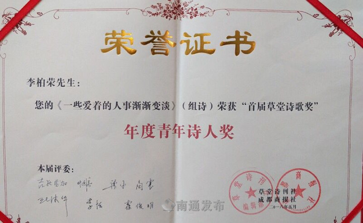 记者6月1日从南通大学获悉,在5月30日举行的“首届草堂诗歌奖”颁奖典礼上,南通大学文学院学生李柏荣凭借组诗《一些爱着的人事渐渐变淡》荣获年度青年诗人奖。典礼上共颁发年度诗人奖1项、年度诗评家奖1项、实力诗人奖2项、青年诗人奖3项。