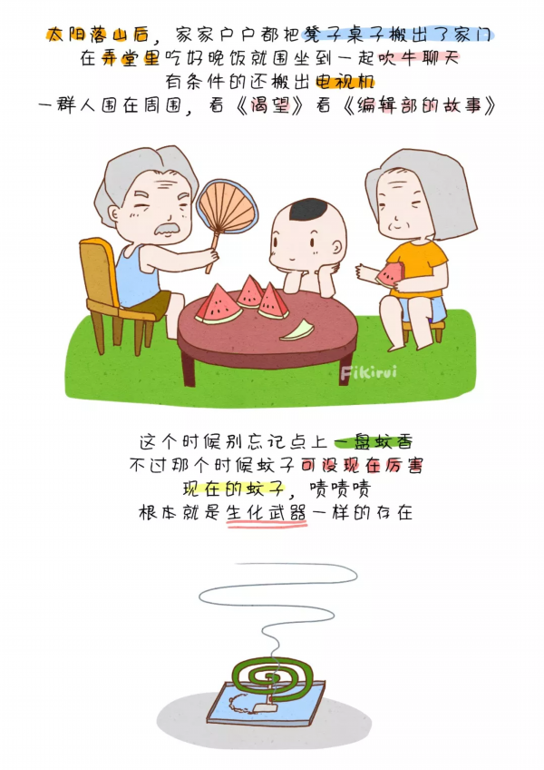 当时小弄堂里一到傍晚,家家户户就把桌椅搬出房屋,边摇扇子边吃晚饭。吃好晚饭就聚在一起聊天,听广播或者看外接的电视。小孩子往往没什么耐心长坐,三三两两在人群中跑来跑去玩耍嬉戏。