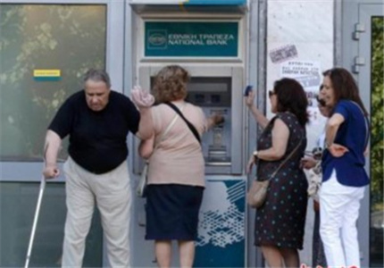 资料图:希腊雅典街头,民众在自助取款机前排队取钱。