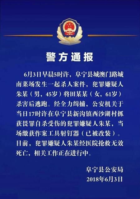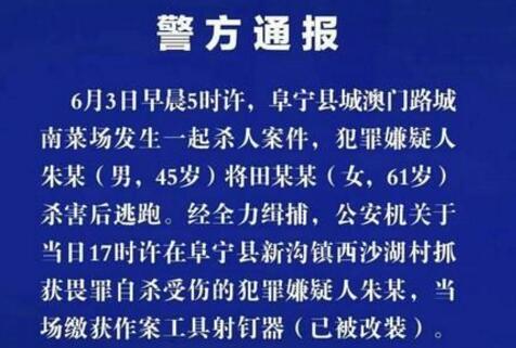 3日晚,阜宁县公安局发布警方通报:6月3日早晨5时许,阜宁县城澳门路城南菜场发生一起杀人案件,犯罪嫌疑人朱某(男,45岁)将田某某(女,61岁)杀害后逃跑。经全力缉捕,公安机关于当日17时许在阜宁县新沟镇西沙湖村抓获畏罪自杀受伤的犯罪嫌疑人朱某,当场缴获作案工具射钉器(已被改装)。目前,犯罪嫌疑人朱某经医院抢救无效死亡,相关工作正在进行中。