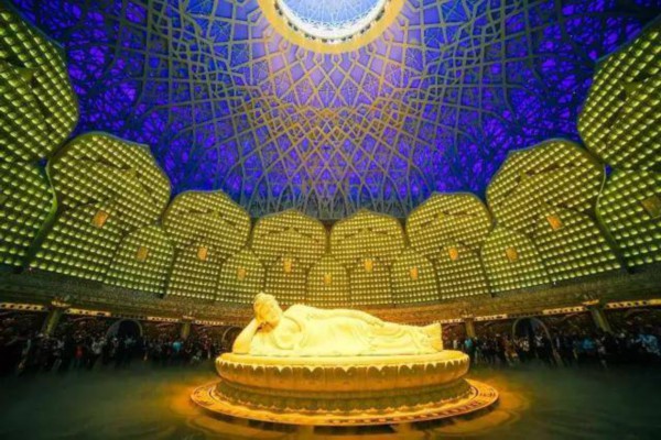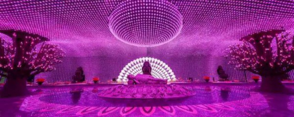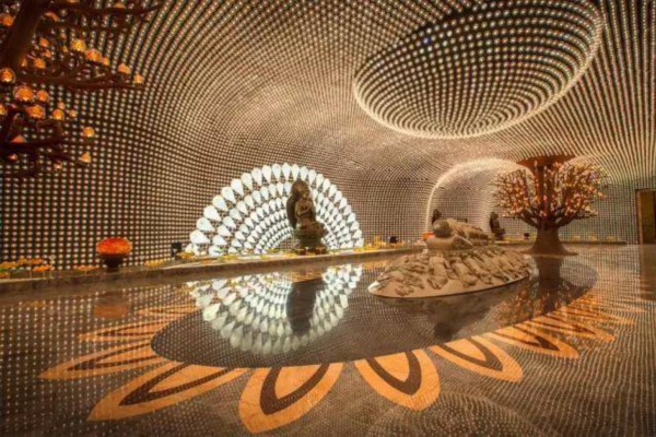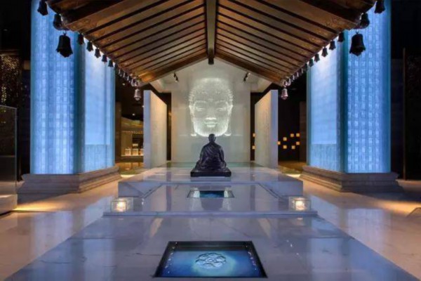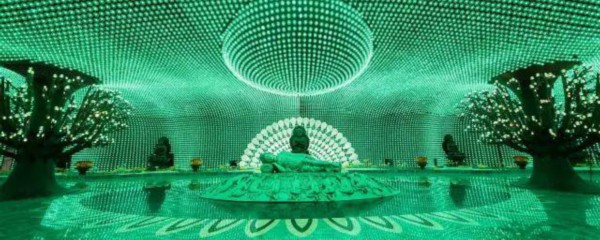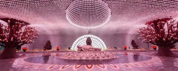 展厅的中央呈现佛陀涅槃于娑罗双树之下,背后五方佛宝相庄严,还会不定时幻化七色光芒,在这里你可以感受到现代技术营造的“万千舍利绽放万千光华”的璀璨场景。