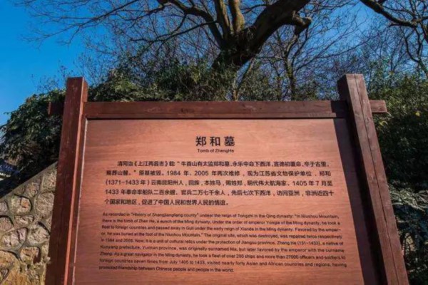 墓南北长300米,东西宽60米,高约8米。墓盖下部雕饰祥云草叶莲花座,瓦梁状的墓顶雕有阿拉伯文“安拉伟大”之字。墓道入口的郑和纪念馆,里面陈列着他的画像及郑和的《航海图》等有关文物。