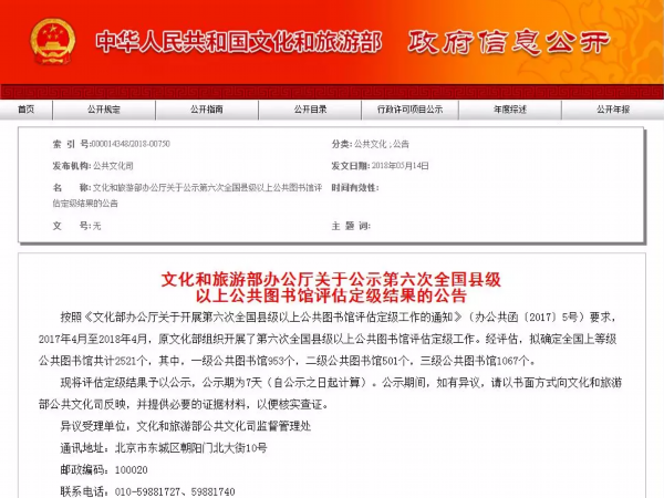 近日,中华人民共和国文化和旅游部官网公布了第六次全国县级以上公共图书馆评估定级结果。经评估,拟确定全国上等级公共图书馆共计2521个,其中,一级公共图书馆953个,二级公共图书馆501个,三级公共图书馆1067个。