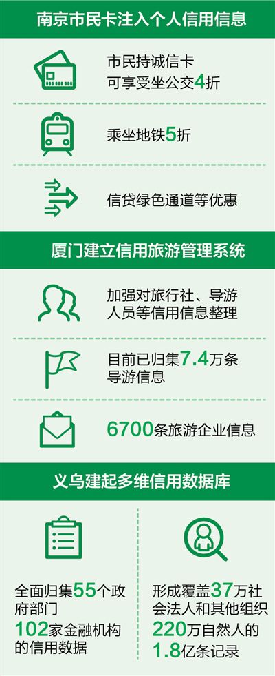 国家发展改革委、中国人民银行今年1月联合公布首批社会信用体系建设示范城市名单,南京、厦门、义乌等12个城市“上榜”。通过建立社会信用体系建设推进机制和公共信用信息共享平台、建立红黑名单及管理办法、创新信用惠民惠企措施等,城市信用体系建设不断推进,守信者受益、失信者难行的社会氛围正在形成。