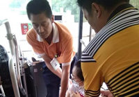 发现女士晕倒后,全车人都出主意,或者动手帮忙,陶师傅先是与下图这位男士下车把孕妇抬上车。