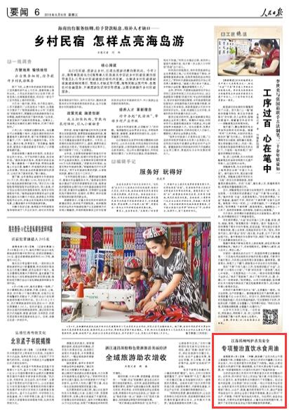 我苏网讯 6月6日,《人民日报》6版刊登了题为《专项整治直饮水食用油》的文章,点赞江苏邳州呵护舌尖安全。全文如下: