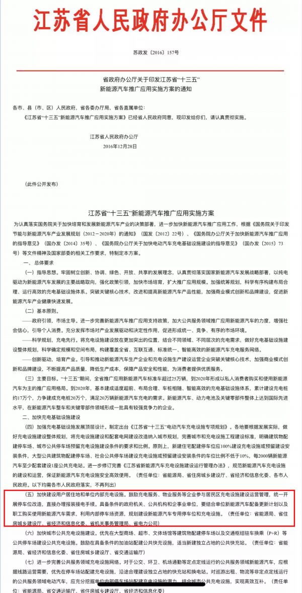 徐通博介绍,目前昆山还没有出台相应的文件,但此前省政府出台过一份《江苏省十三五新能源汽车推广应用实施方案》其中基本原则中的第五条指出要加快建设用户居住地和单位内部充电设施。