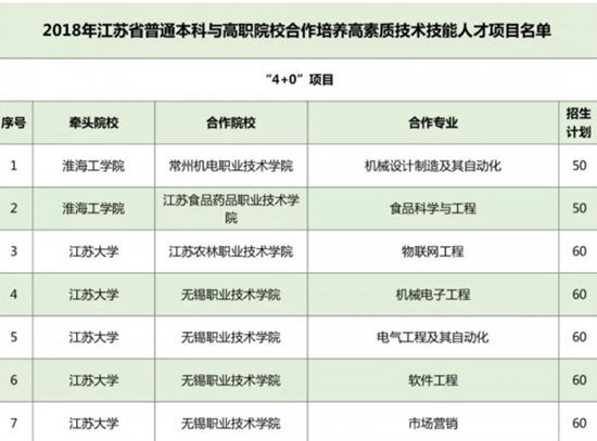 据江苏教育发布 根据《省教育厅关于做好2018年江苏省普通本科与高职院校合作培养高素质技术技能人才工作的通知》精神,经高校自主申报、专家评议、省教育厅审定,同意2018年实施135项普通本科与高职院校合作培养高素质技术技能人才项目。详情》