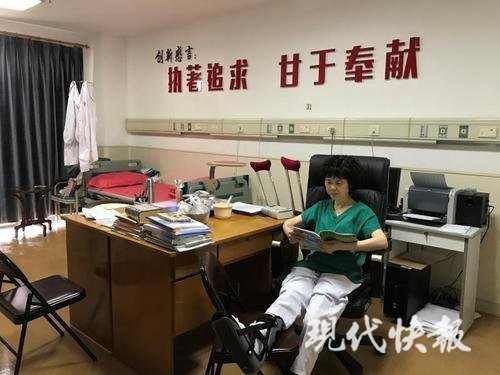 右脚骨折打了石膏原本应该在家静养,但常州妇幼保健院的妇科专家许培箴却每天坐轮椅拄着拐杖来往于医院的的各个部门,门诊、查房、手术、带教一个都没落下。