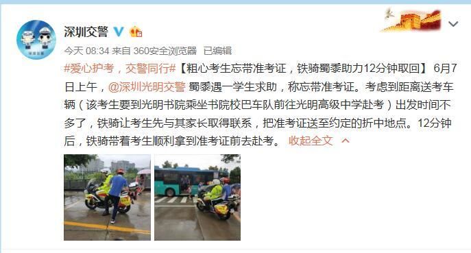 今天上午,深圳交警遇上一学生求助,称忘带准考证。考虑到距离送考车辆出发时间不多了,交警让考生先与家长取得联系,把准考证送至约定的折中地点。12分钟后,交警带着考生顺利拿到准考证前去赴考。