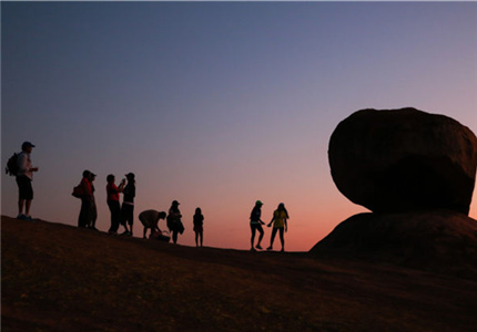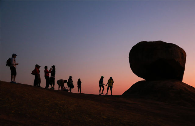 2015年11月9日,在哈拉雷东坡莎瓦山上,几名游客在一处平衡石景点旁边观赏日落。(新华社发,王新举摄)