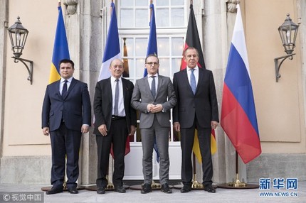 6月11日,德国柏林,乌克兰外长克利姆金、法国外长勒德里安、德国外长海科·马斯和俄罗斯外长拉夫罗夫举行会谈,就乌克兰冲突问题进行讨论。(图片来源:视觉中国)