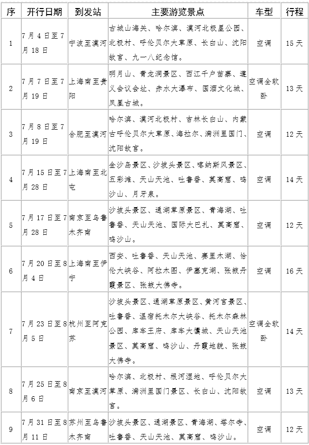 7、8月长三角铁路旅游列车开行安排表