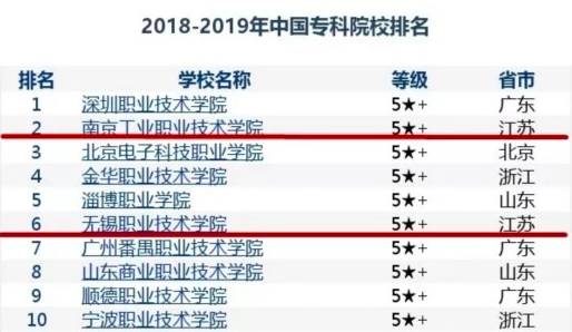 据无锡发布 最近,2018-2019年中国专科院校排名出炉,我大江苏成绩喜人。排名数据包括了1386所高职高专院校,南京工业职业技术学院等13所江苏学校入围前100名,真是棒棒哒。详情>>