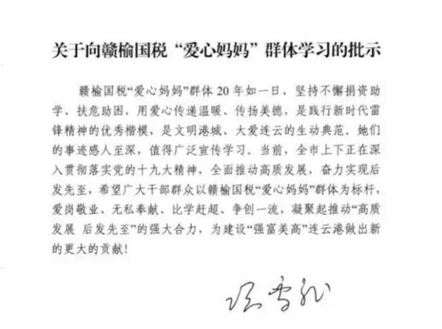 赣榆国税“爱心妈妈”群体20年如一日,坚持不懈捐资助学、扶危助困,用爱心传递温暖、传扬美德,是践行新时代雷锋精神的优秀楷模,是文明港城、大爱连云的生动典范。她们的事迹感人至深,值得广泛宣传学习。当前,全市上下正在深入贯彻落实党的十九大精神,全面推动高质发展,奋力实现后发先至,希望广大干部群众以赣榆国税“爱心妈妈”群体为标杆,爱岗敬业、无私奉献、比学赶超、争创一流,凝聚起推动“高质发展后发先至”的强大合力,为建设“强富美高”连云港做出新的更大的贡献!