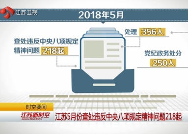 江苏省纪委6月15日通报,全省5月份共查处违反中央八项规定精神问题218起,处理356人,其中给予党纪政务处分250人。