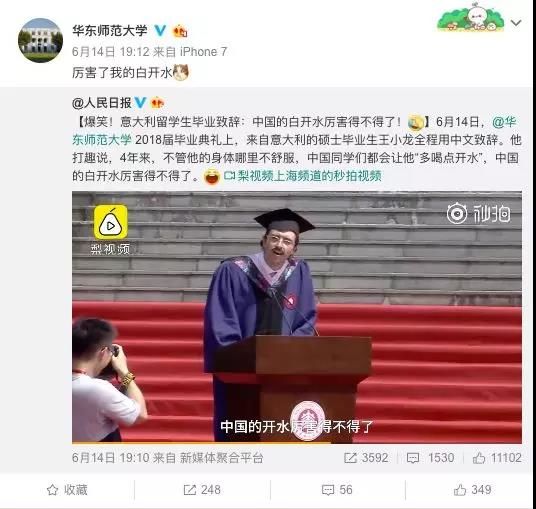 6月14日,华东师范大学2018届毕业典礼上,来自意大利的硕士毕业生王小龙(Carlo)作为毕业生代表,上台演讲发言。