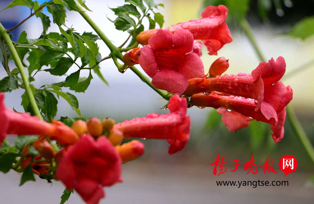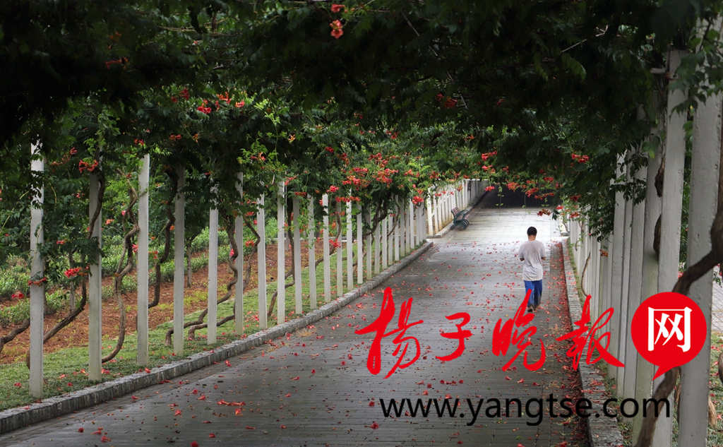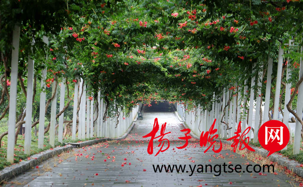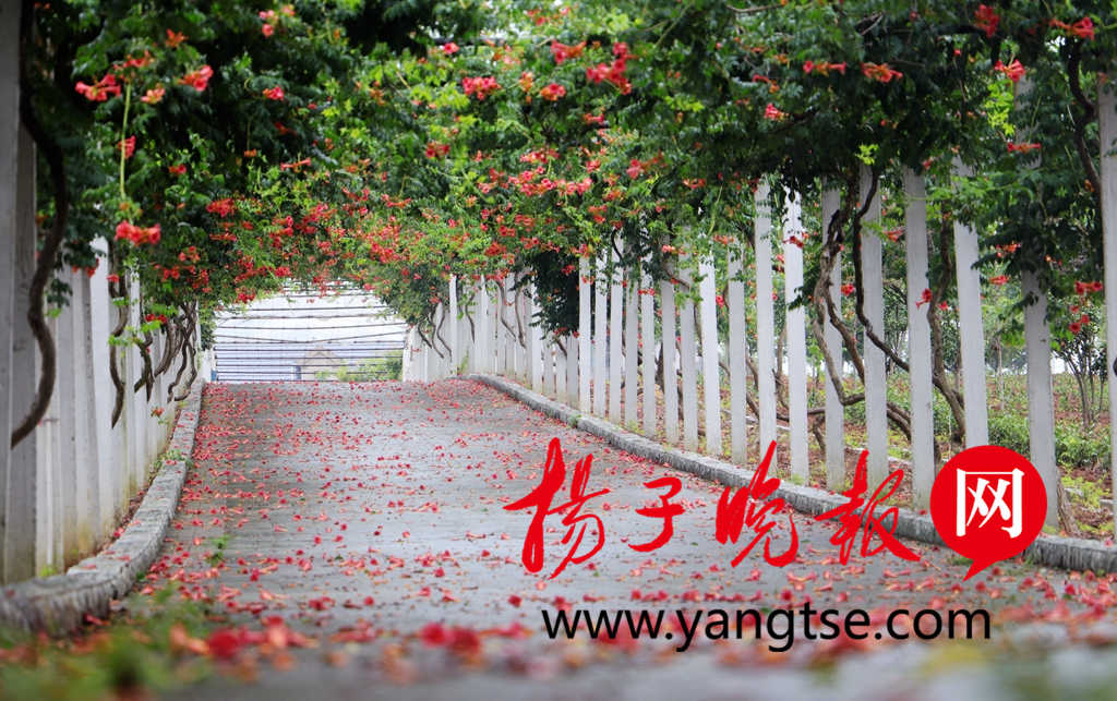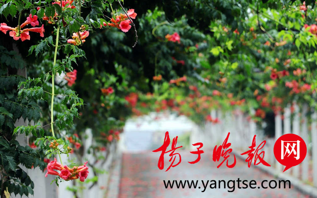 盛夏时节,正是凌霄花绽放的时候。22日傍晚,一场降雨过后,位于句容后白镇张庙茶场里的千米凌霄花长廊里,空中花开点点,地上落红满地,为夏日里增添了一道别样的风景。