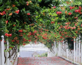 据了解,这里的凌霄花长廊大约 1000 米左右,两边都是青青的茶园。凌霄花花期从6 月份开始一直到9 月份,每年夏天,这里都是绿叶满架花枝伸展,此落彼开,让茶园里日日美色灿烂。