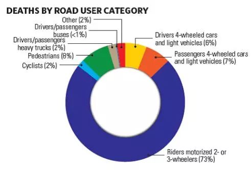大多数肇事车辆是摩托车,其他车辆的事故也时有发生,包括汽车、客车和小型巴士。