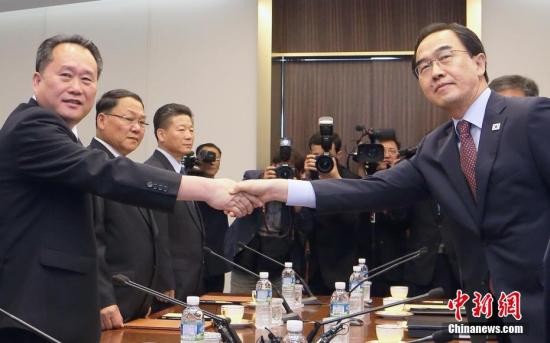 6月1日,韩朝在板门店韩方一侧“和平之家”举行高级别会谈,讨论落实韩朝领导人4月27日签署的《板门店宣言》具体事宜。韩方代表团由统一部长官赵明均(右一)担任首席代表,朝方由朝鲜祖国和平统一委员会委员长李善权(左一)率团与会。中新社发 共同采访团供图