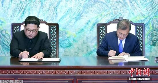 当地时间4月27日,韩朝首脑会晤在板门店举行,文在寅和金正恩跨越军事分界线实现历史性握手。双方领导人在经过一天会谈后,共同签署了《板门店宣言》,双方确认了通过完全弃核实现半岛无核化的共同目标,争取年内宣布结束战争状态,实现停和机制转换。图为签署仪式现场。