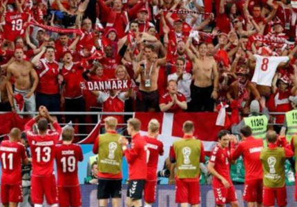 图为丹麦球员赛后与球迷们共同庆祝胜利。