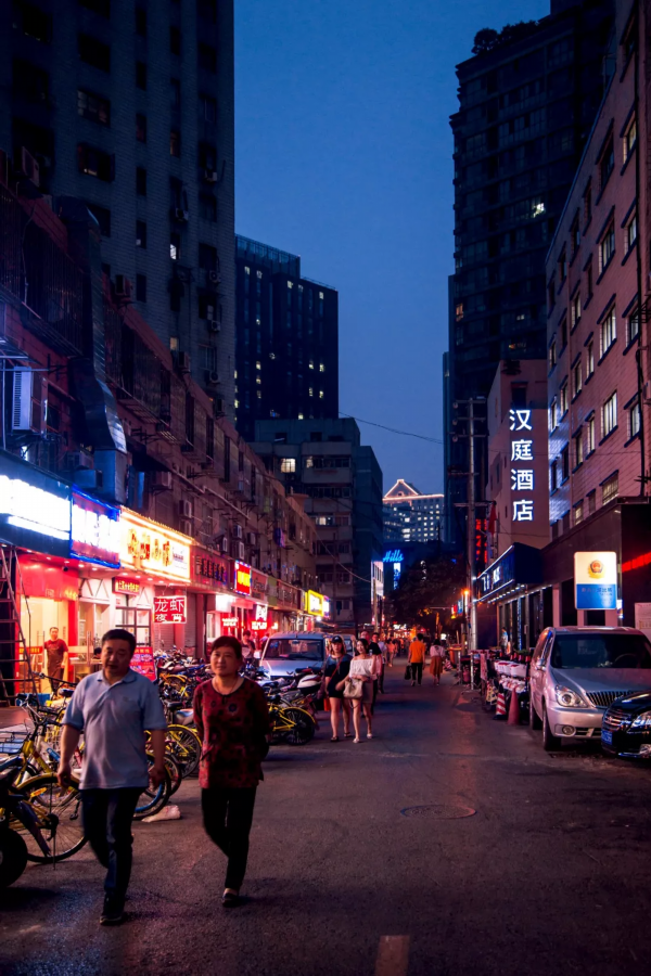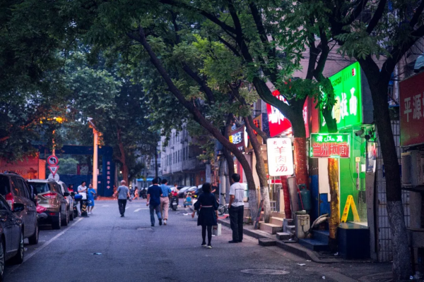 不长的唱经楼西街有种大隐隐于市的感觉。两侧高楼林立,笔直的街巷闪着星星光彩,恍惚间像到了霓虹国的街头。