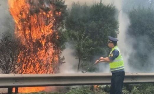 见此情景,戴法宝、陈育政两人立即采取措施。一人在现场不远处设置警示标志,打开车载警报器,提醒过往车辆减速慢行,同时将火情通报消防119;一人则迅速拿起车上所备灭火器,扑向火源。由于火势较大,灭火器根本无法将火扑灭,在用完灭火器后,戴法宝又迅速找来木棍继续灭火,在经过15分钟的奋力扑救后,大火基本被扑灭。此时,消防车也到达了现场,众人合力将明火扑灭。