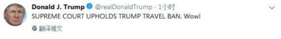 海外网6月27日电 当地时间周二(26日),美国最高法院裁决支持特朗普针对一些中东非洲国家的旅行禁令。对此,特朗普第一时间在推特回应称,最高法院支持我的旅行禁令,棒极了!
