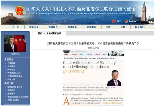 2018年6月27日,英国主流大报《卫报》网络版刊登驻英国大使刘晓明题为《中国不容美国在南海“秀肌肉”》的署名文章。全文如下: