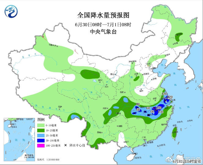 6月30日至7月1日,长江中下游地区有较强降雨,局地有暴雨或大暴雨,并伴有短时强降水、雷暴大风等强对流天气,2日开始,上述地区强降水减弱。