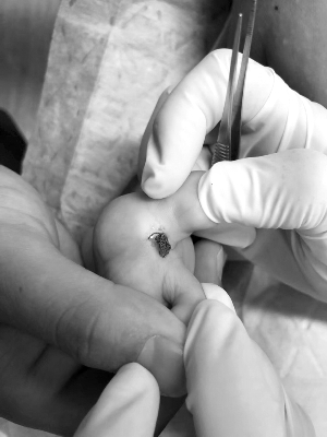 听了楚楚爸爸的描述,医生仔细检查了楚楚的“黑痣”,判断这是一只蜱虫。“估计蜱虫咬伤孩子的时间不久,脚还露在外面,身子已嵌入脚趾中。”医生边替楚楚检查,边表扬了楚楚爸爸行动果断。