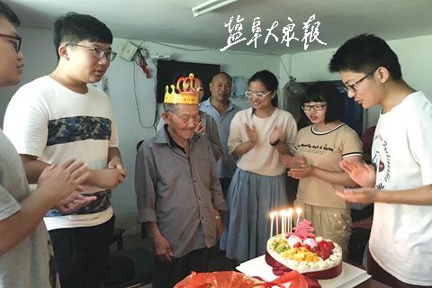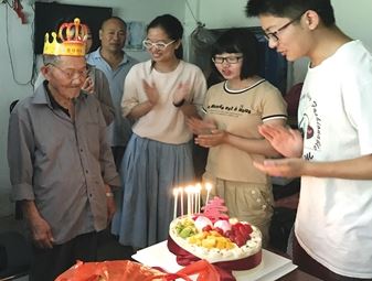 7月1日是中国共产党建党97周年纪念日,同时也是老党员曹正国的90岁生日,当日上午,盐城师范学院化学与环境工程学院党员、入党积极分子代表再次来到曹正国家中,为他送去节日的问候,并带了蛋糕、水果为曹正国庆生。