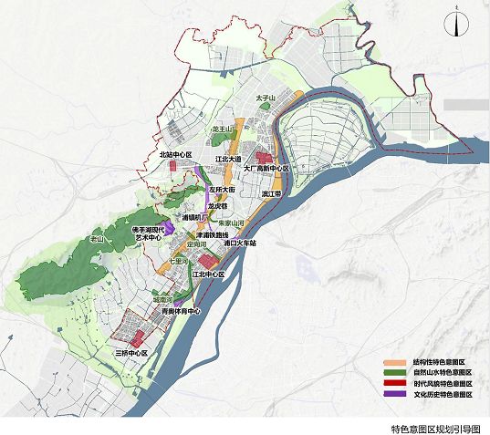 划定结构性特色意图区、自然山水特色意图区、时代风貌特色意图区、文化历史特色意图区等四大特色意图区。