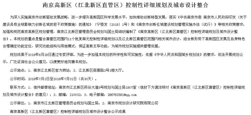 7月3日,江北新区官方发布《南京高新区(江北新区直管区)控制性详细规划及城市设计整合》文件。整个江北直管区范围的规划、定位、发展方向等第一次曝光。