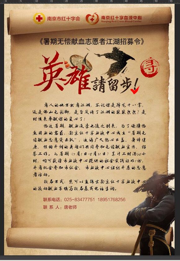 无偿献血和志愿服务是社会进步与文明的标志,也是我国社会主义精神文明建设的重要组成部分。临近暑期,献血淡季也随之到来,为了保障临床用血的需求,南京市红会和南京红十字血液中心成立“暑期无偿献血志愿突击队”。现发布暑期无偿献血志愿突击队招募令,邀请广大热心于公益、身体健康的英雄们共同参加无偿献血宣传、招募工作。凡暑期(7月1日—8月31日)累计工时满20小时,均可获得南京红十字血液中心社会实践证明1份,参加市红会和市血液中心组织的活动。