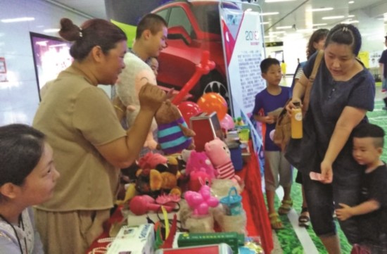 昨天上午,地铁三阳站里,就读于沁园实验小学三年级的左童谣卖力吆喝着。她捐出了100元压岁钱,还从家里带来了心爱的娃娃套装之类义卖。不少义工朋友带着书籍、杯子等家里的闲置物品过来义卖。有的义工还特意定制了“无锡励志包”字样的气球送给路过的小朋友。