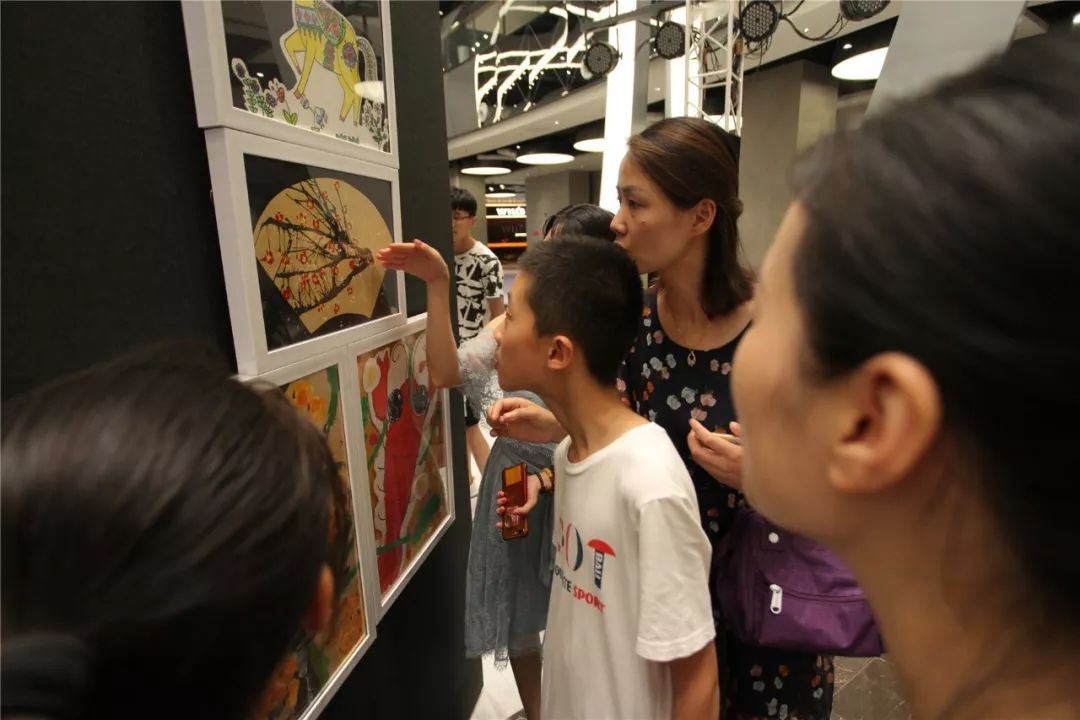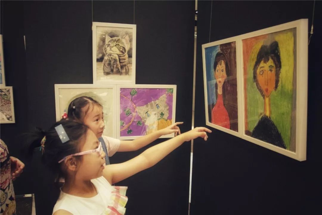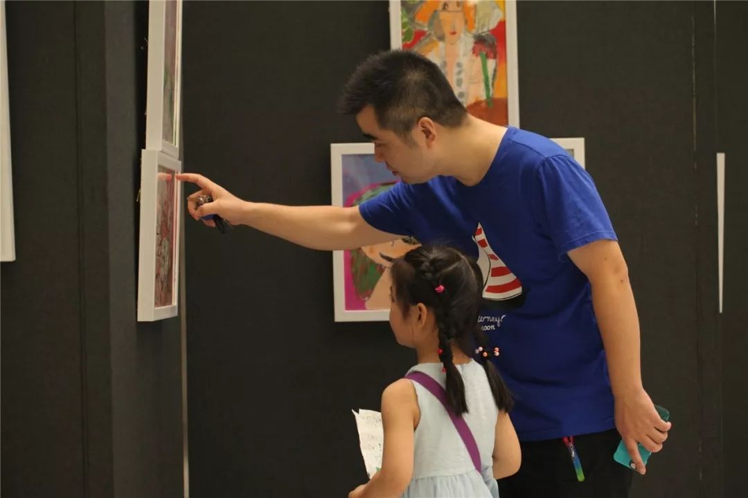 家长陪同孩子看画展