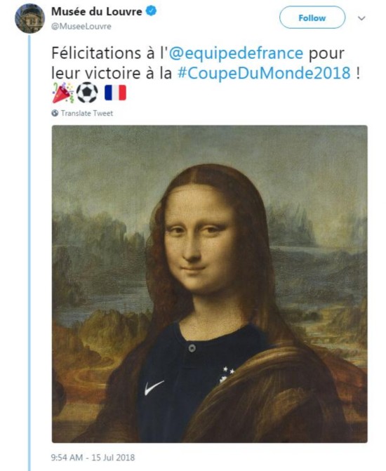 报道称,当地时间15日,卢浮宫在推特上传了一张“穿有法国国家队球衣”的蒙娜丽莎画像,并配文称,“祝贺法国队夺得2018世界杯冠军”。