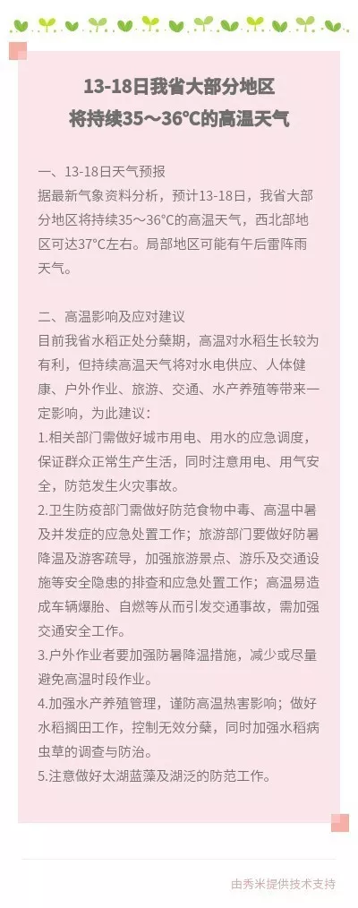 气象专家介绍,本次高温范围大、持续时间长、强度强、影响位置偏北。从目前预报看,这将是今年以来范围最广、强度最强的一次高温过程。
