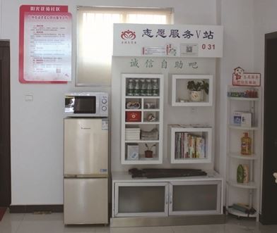在阳光花苑社区居委会的户外劳动者爱心驿站,记者看到,这里摆放了矿泉水、微波炉、急救箱、针线包、眼镜、血压计、雨衣等物品,工作人员告诉记者,环卫工人在这里可以用微波炉热饭,也可以喝水休息。